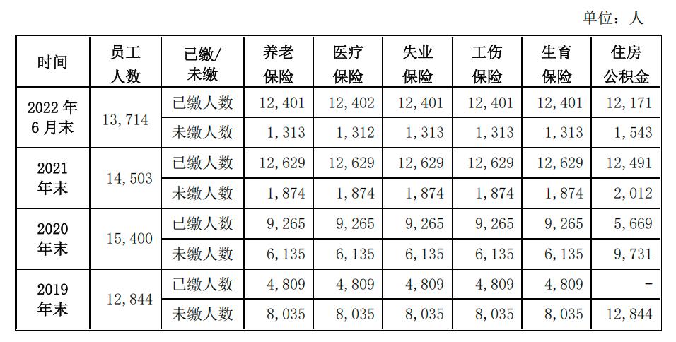 此前寻求A股上市期间,老乡鸡就曾因未脚额缴纳社保和公积金问题激发大量会商。据此提交的招股书显示,2019年、2020年、2021年及2022年上半年,老乡鸡员工总数别离为12844人、14503人和13714人,此中未缴纳社保(养老、医疗、赋闲、工伤、生育五项安全)的人数别离为8035人、6135人、1874人和1313人,未缴纳比例别离为62。55%、39。84%、12。92%和9。57%。
