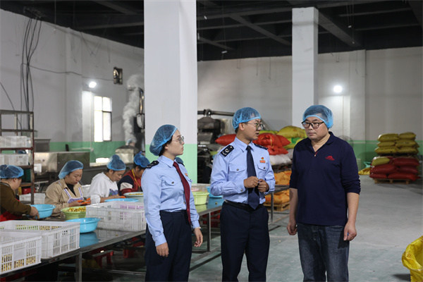 望谟县税务局税务干部走进贵州望财栗业商贸无限公司出产车间,领会板栗出产加工环境,宣传税费政策。(李孝钦 摄)。