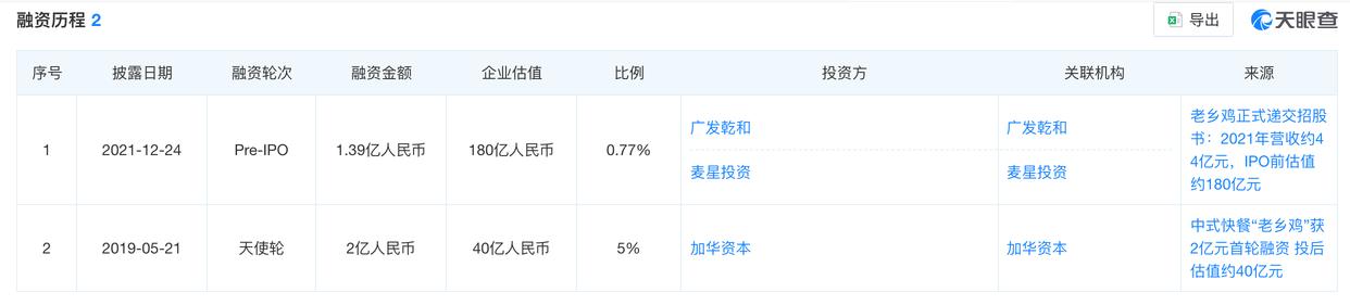 从外部融资过程来看,天眼查显示,老乡鸡自开办以来共履历两轮融资。2019年,加华本钱通过旗下基金注资约2亿元,成为老乡鸡首家外部投资机构,彼时老乡鸡估值达到40亿元,尔后正在2021年,麦星投资和广发乾和合计向老乡鸡注资1。39亿元,这轮融资竣事后,老乡鸡估值攀升至180亿元人平易近币。